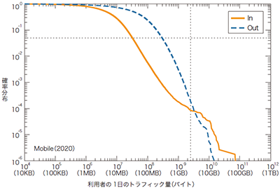モバイルでも、OUT側ではヘビーユーザはべき分布していますが、IN側では直線的な傾きが崩れていて、大量にアップロードするユーザの割合が大きくなっています。今年は、INの分布の右端が更に右側に伸びていて、一部の大量アップロードするユーザのアップロード量が一層増えています。
