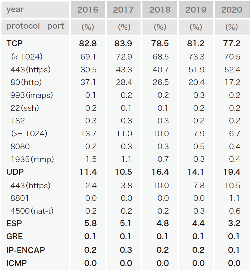 表-3はブロードバンド利用者のポート使用割合の過去5年間の推移を示します。2020年の全体トラフィックの77%はTCP です。HTTPSのTCP443番ポートの割合は、52%で前回とほぼ同じです。HTTPのTCP80番ポートの割合は20%から17%に減っています。QUICプロトコルで使われるUDP443番ポートは、8%から11%に増えていて、HTTPの減った分とQUICの増えた分がほぼ同じです。