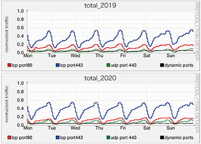 図-8は、ブロードバンド全体トラフィックにおける主要ポート利用の週間推移を、2019年と2020年で比較したものです。TCPポートの80番、443番、1024番以上の動的ポート、UDP ポート443番の4つに分けてそれぞれの推移を示しています。グラフでは、ピーク時の総トラフィック量を1として正規化して表しています。2019年と比較すると、コロナ禍での在宅時間の増加に伴い、平日昼間のトラフィックが大きく増えているのが分かります。全体のピークは19時から23時頃です。