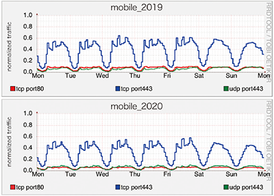 図-9のモバイルでは、トラフィックの大半を占めるTCP80番ポートと443番ポート、UDP443番ポートについて推移を示します。2019年と比較すると、モバイルはほとんど変化がありません。ブロードバンドに比べると、朝から夜中までトラフィックの高い状態が続きます。平日には、朝の通勤時間、昼休み、夕方17時頃から22時頃にかけての3つのピークがあり、ブロードバンドとは利用時間の違いがあることが分かります。