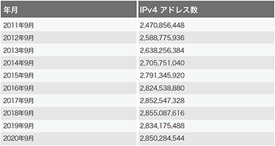 次に「IPv6フルルート」の情報を確認します(表-3)。なお2019年11月にはARINに対して/12ブロックの最初の追加割り振りが行われています(同6月のRIPE NCCに続いて2番目)。