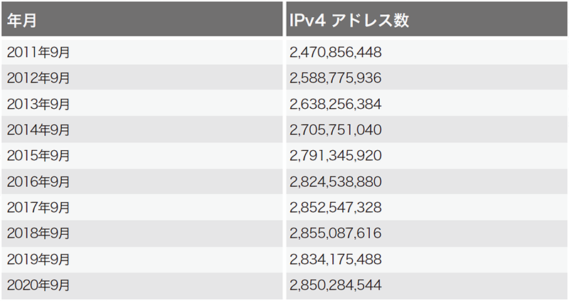 表-2「IPv4フルルート」に含まれる unique IPv4アドレス総数の推移