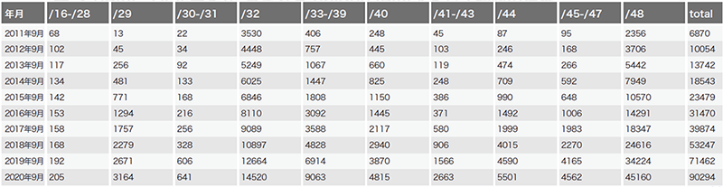 最初に、IIJ網から他組織に広報している「IPv4フルルート」の情報(表-1)及び「IPv4フルルート」に含まれるunique IPv4アドレス数の情報(表-2)を確認します。なおこの1年の間にRIPE NCC及びLACNICのIPv4アドレス在庫が完全枯渇を迎えています。残るはAPNICとAfriNICですが、APNICは既に2021年初めの完全枯渇予測が出ており、またAfriNICでは2020年1月から割り振り/割り当てサイズに上限(/22)が設けられています。