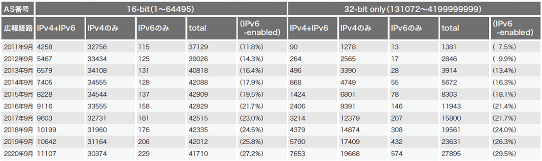 最後に「IPv4/IPv6フルルート」広報元AS(Origin AS)数を確認します(表-4)。なおこの1年の間に、RIPE NCCに3072、LACNICに2048の32-bit only AS番号が追加割り振りされています。
