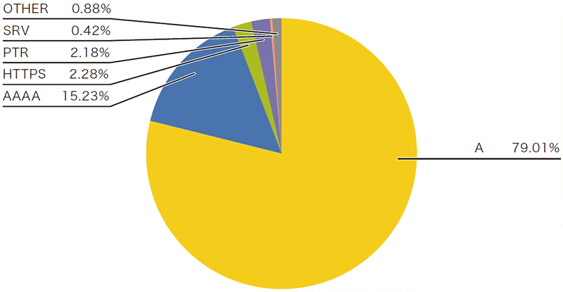 問い合わせレコードタイプに注目すると、ホスト名に対応するIPv4アドレスを問い合わせるAレコードとIPv6アドレスを問い合わせるAAAAレコードがほとんどを占めています。AとAAAAの問い合わせ傾向は通信に利用されるIPプロトコルで違いが見られ、IPv6での問い合わせではより多くのAAAAレコード問い合わせが見られます。IPv4での問い合わせでは、全体の79%程度がAレコード問い合わせ、15%程度がAAAAレコード問い合わせです(図-1)。一方IPv6での問い合わせでは、全体の51%程度がAレコード問い合わせ、41%程度がAAAAレコード問い合わせとAAAAレコード問い合わせの比率が高まっています(図-2)。昨年と比べるとIPv4で5ポイント、IPv6で3ポイント程度Aレコードの問い合わせが減っています。今年は新しく実装されたばかりのHTTPSタイプのDNS問い合わせがIPv4で2%、IPv6で6%程度を占め、AとAAAAに次ぐ問い合わせ量になっています。この問い合わせは現状でApple社のiOS 14などがサポートしているようで、今後実装が広がるに連れて徐々に増加すると予想しています。
