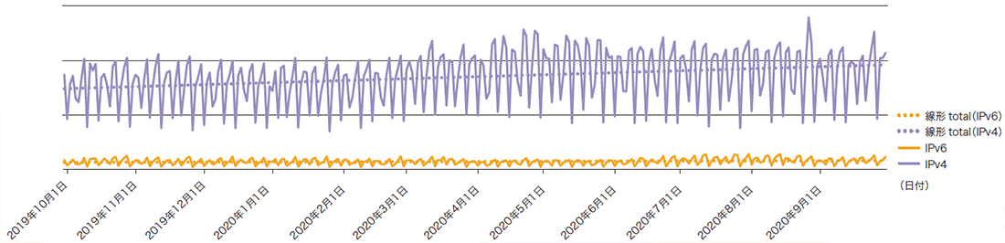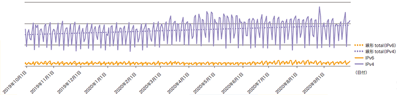 図-3 IPv4トラフィックとIPv6トラフィック(2019年10月〜2020年9月)