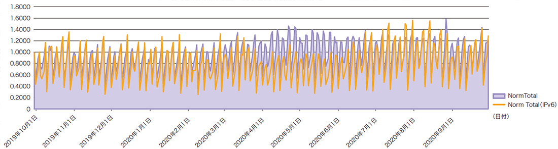 今回は計測期間中の増減を相対的に把握するため、計測開始日(2019年10月1日)のIPv4、IPv6それぞれのトラフィックを1として正規化したグラフを作成(図-4)してみました。グラフ中程の4月から5月あたりが緊急事態宣言による外出自粛期間ですが、この期間はIPv4トラフィックが約8%増え、IPv6トラフィックは減少しているように見えます。緊急事態宣言終了後はIPv4トラフィックの増加は落ち着き、計測開始時と比べると微増、IPv6トラフィックも最終的には微増となっています。