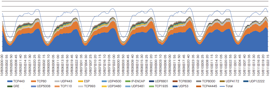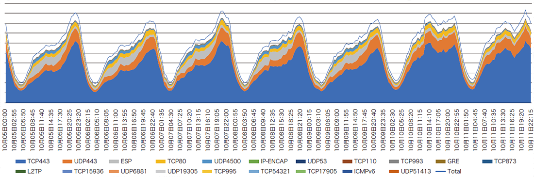 IPv6の1位はTCP443(HTTPS)、2位はUDP443(QUIC)となっており、HTTP系暗号化プロトコルで8割を超えるほどです。今回特徴的なのはTCP80(暗号化なしHTTP)が4位に落ち、ESP(IPSec暗号化)が3位に入ってきていることでしょうか。ESPは平日日中帯により多く観測されており、土日は少ないことから、企業ネットワークにおいて、IPv6 VPNの利用が増加しているものと思われます。平日昼の最も多い時間帯に全体の19%程を占めており、日中はQUICを逆転する程です。なお、グラフで見て取れるのは5位までであり、6位以下は量が少なく、グラフで確認することが困難なほどの量しかありません。