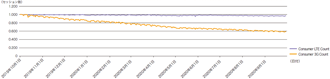 次に、2019年10月1日を基準日としたときのコンシューマ向けサービスのトラフィック量(図-11)とセッション数(図-12)に関する傾向をグラフに示します。コンシューマ向けサービスの3Gトラフィックに関してはトラフィック量、セッション数共に右肩下がりとなっており、ここ1年間でトラフィック、セッション数共に40%程度減っています。要因はいろいろと考えることができますが、コンシューマサービスの接続端末はほぼスマートフォンであることを考えると、世間でのLTEの接続環境が向上しており、3Gに落ちることが少なくなっていることが考えられます。今後どのような推移を見せていくかは確認していきます。