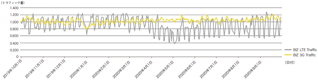 今回はIIJで提供しているモバイルサービスにおける3Gトラフィックの傾向について解説します。対象期間は2019年10月1日から2020年9月30日です。