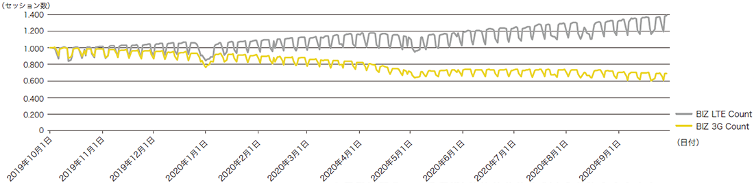 また、LTEのトラフィック傾向ですが、セッション数では3Gと同様に自粛期間中の落ち込みはあるものの、断続的な増加傾向にあります。またトラフィック量に関しても自粛期間である2020年4月〜5月を底として、いまは徐々に戻ってきている状況にあります。