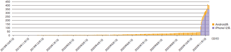 図-15のグラフは、「端末名に5Gと入っているAndroid端末」と「iPhone12シリーズ」という5G対応と思われる端末が2019年10月1日を基準日としたときの増加率を示したものです。iPhone12がリリースされる前までは1年間で40倍程度の増加でしたが、リリース後には1年前の約400倍(リリース直前に比べ約10倍)に増加しています。今後は5Gサービスに関するトラフィック傾向にも注視していきたいと思います。