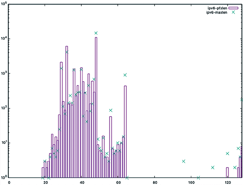 次に、ROAに登録されているprefix長とmax lengthの分布を図-16、図-17に示します。