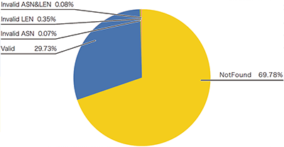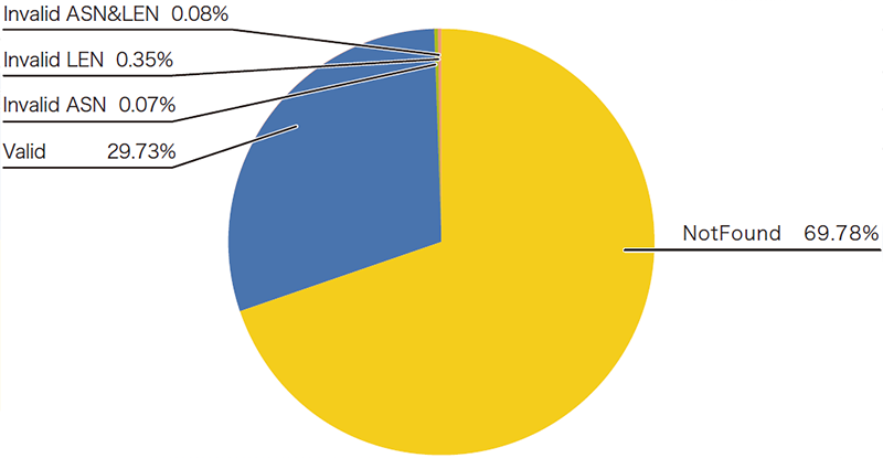Validとして判定されるのは、IPv4では24%、IPv6では29%程度であり、Invalidとして判定されるものは、IPv4では0.32%, IPv6では0.49%程度となりました。ROAに合致するprefixがないものはNotFoundとして示されており、全体の7割がそれにあたります。今後ROAの登録がすすむにつれて、NotFoundの割合は少なくなっていくと期待しています。また、Invalidな経路であっても、より大きい空間がValidやNotFoundとして判定されるケースがあるため、Invalidな経路として判定されたとしても、必ずしも到達性がなくなるわけではありませんが、そうでない経路も存在しており、IPv4の0.028%、IPv6の0.02%程度がそれにあたります。