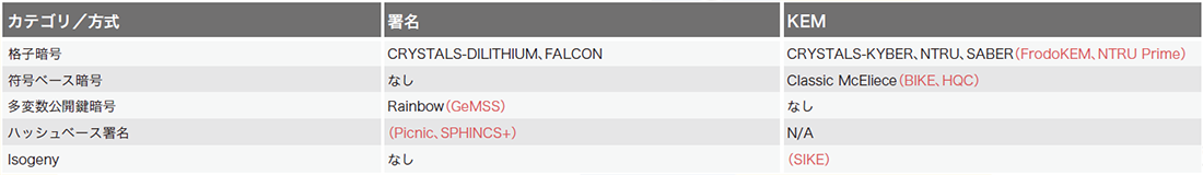 ファイナリスト7つのうち署名は3方式(格子暗号2、多変数公開鍵暗号1)、KEM(鍵カプセル化メカニズム)は4方式(格子暗号3、符号ベース暗号1)となっています。それぞれのアルゴリズムは第3ラウンドに入った段階で若干の修正が認められており、第3ラウンドのページ(注12)に仕様やWebサイトに関する情報が記載されています。またUpdateについてもPDFが提供されています(注13)。