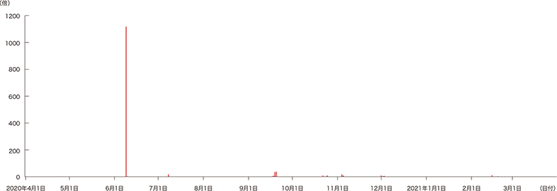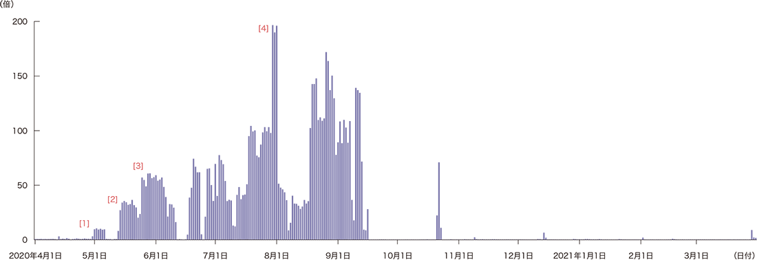 2020年度上半期は、これまでに類を見ない量の迷惑メールを断続的に観測しました。縦軸を最大値に合わせているため確認しづらくなっていますが、4月の平均を1としたとき、5月上旬の第1波で約10倍[1]、5月中旬の第2波で約40倍[2]、5月下旬から6月の上旬で約60倍[3]規模の迷惑メールを集中的に受信しました。この状況が断続的に続き、7月末には約200倍[4]もの迷惑メールを受信しています。一般的な組織の設備設計で平常時の200倍の規模に耐えられる設備投資をすることは稀だと思いますので、DDoS攻撃と言っても過言ではないでしょう。