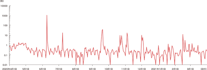 図-1は、2020年4月~2021年3月における、IIJ管理のハニーポットに着信した迷惑メールの数を集計したものです。