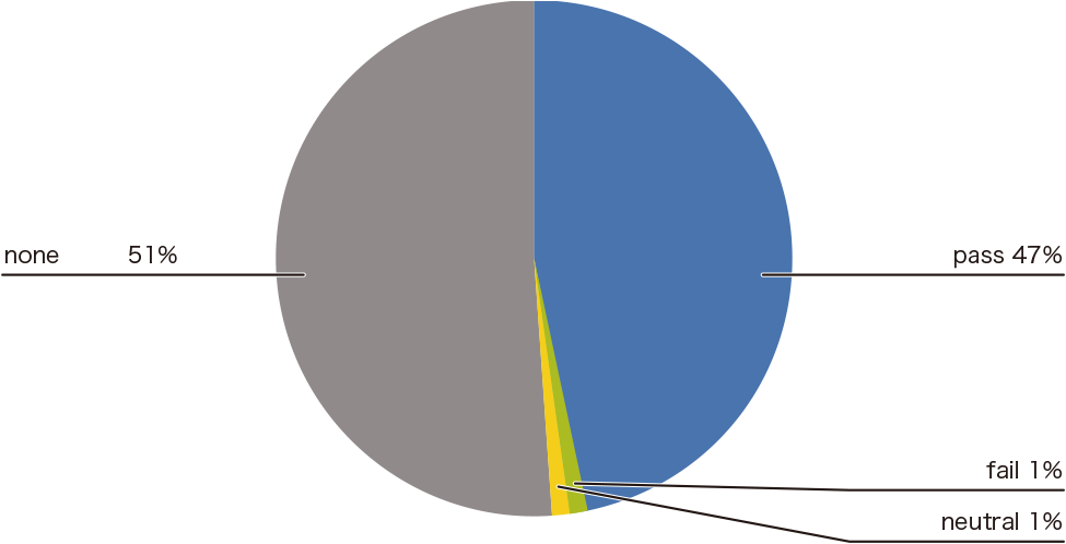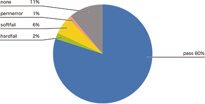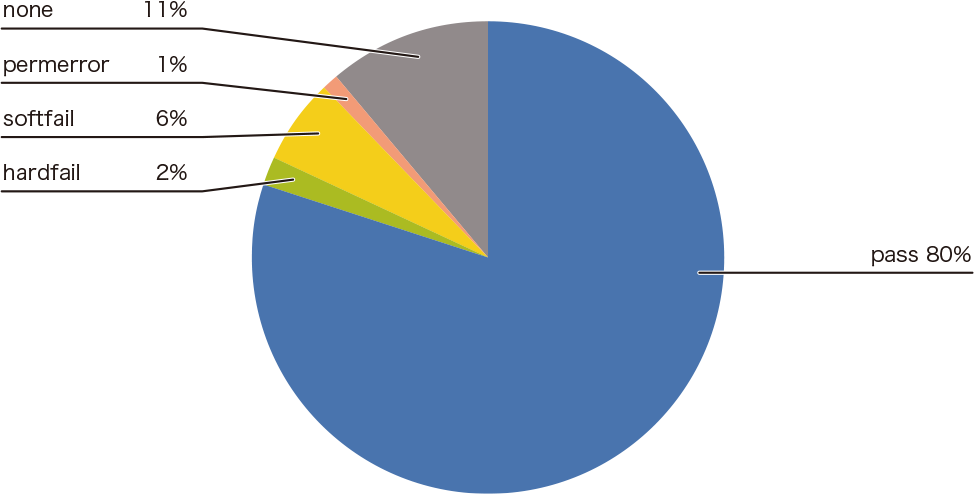自社ドメインになりすましたメールへの対策や、有名ブランドを騙ったフィッシング対策に送信ドメイン認証技術が効果的であるのは間違いありませんが、ここに示すデータは受信メールの総数を母数としたときに対する送信ドメイン認証の結果の割合を示したものであり、例えば、メール配信事業者が送信するようなボリュームの大きいメールを受信すると、その数がデータに対して支配的になる傾向があることに留意してください。また、迷惑メールを送信する者も迷惑メール送信用のドメインを取得して送信ドメイン認証に対応してきますので、一概にpassだから非迷惑メールとは限らない点に注意する必要があります。
