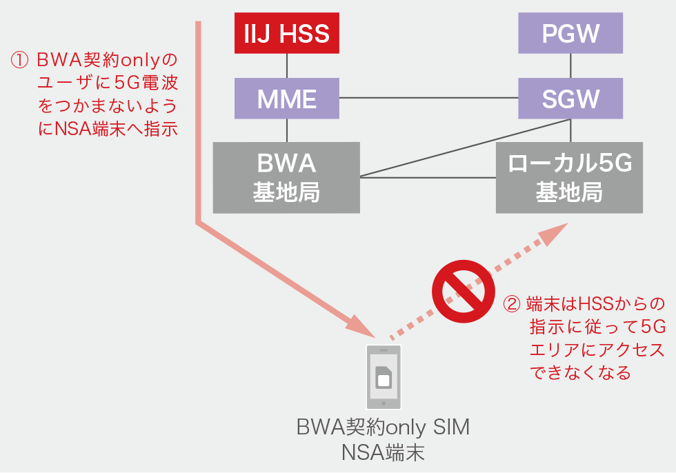 NSA化で必要となる装置は、HSS/MME/S-GW/P-GW/4Gアンカー(BWA)基地局/ローカル5G基地局です。IIJはフルMVNO化により、既にHSSを自前で保有しています。そのため、HSSに対して、NSA化に必要な開発を実施しました。また、BWAのみ契約したユーザに5Gを使用させないために、HSSに図-1の機能を開発しました。