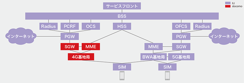 BSS(Business Support System)(注12) ~HSS間のプロビジョニングIFにも変更が必要ですが、既存フルMVNOのIFを対象に、軽微な拡張で済ませることができました。P-GWは、LTE対応MVNOで既に保有しています。MME/S-GWのみを新規に導入する選択肢もありましたが、P-GWを既存IIJモバイルサービスとNSAサービスで共有すると、P-GWのリソース設計が複雑になることと、障害時の切り分けが困難になることから、MME/S-GW/P-GWを新規に導入することにしました。