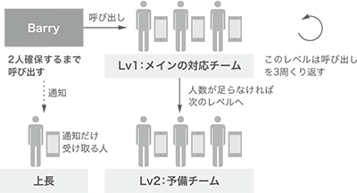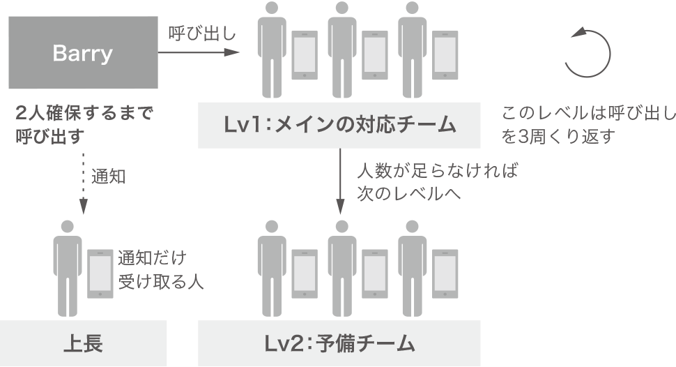 これらの準備ができた状態でサービスの監視アラートが発生すると情報はBarryに送信されます。Barryはアラートを受け取ると、内容を保存し運用チームを特定してエスカレーションを開始します。エスカレーションでは運用チームごとに定義された呼び出しルールに従い、対応可能な担当者が見つかるまでスマートフォンを鳴動させます。