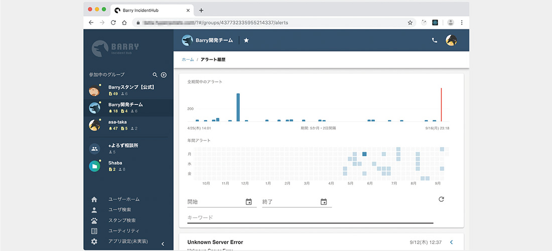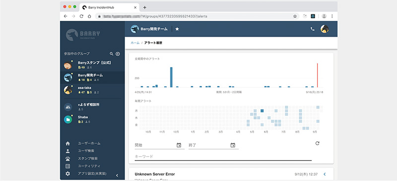 障害対応が終わると、インシデントを完了として更新することでBarryによる対応を終えます。記録したインシデント情報やエスカレーションの履歴はシステム内に記録が残ります。検索機能も備えているため、障害対応中に過去の類似アラート発生時の対応内容を参照するようなこともできます。
