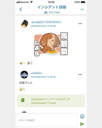 インシデントコメントへの絵文字によるリアクションとスタンプは、円滑なコミュニケーションのために用意しました(図-5)。対応内容に感謝などの感情を示したりする際、コメントとして表現してしまうとインシデントに対する情報が増えてしまい、重要な対応内容が分かりにくくなってしまうという問題があります。このような場合を想定して、絵文字によるリアクション機能を実装しました。また、ソーシャルネットワーキングサービスなどで用いられるスタンプ機能も用意し、定形の情報を簡単に使えられるようにしています。