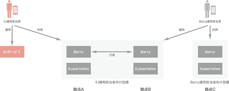 それぞれの拠点では独立したKubernetesクラスタが稼働しており、BarryはKubernetes上で動作しています。Kubernetesの機能を活用する構成により、Barryの運用はハードウェアなどの故障を意識する必要がなくなりました。