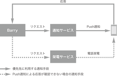 Barryはスマートスマートフォンへの通知に外部サービスを利用しています。外部サービスの障害や遅延が単一障害点とならないよう、複数の外部サービスを組み合わせて実装しています(図-7)。サーバで通知を送信したスマートフォンの反応を確認し、通知の仕組みに異常を検知した場合は自動架電へフォールバックするようにしました。