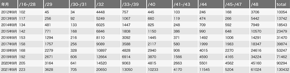 表-2 「IPv6フルルート」に含まれるプレフィクス長ごとの経路数の推移