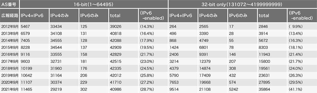 最後に「IPv4/IPv6フルルート」広報元AS(Origin AS)数を確認します(表-4)。なおこの1年の間にAPNICに6144、ARINに2048の32-bit only AS番号が追加割り振りされています。