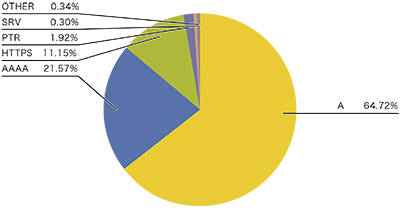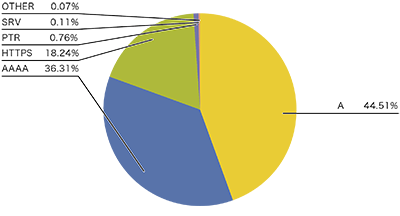 問い合わせレコードタイプに注目すると、ホスト名に対応するIPv4アドレスを問い合わせるAレコードとIPv6アドレスを問い合わせるAAAAレコードが全体の約8割を占めています。AとAAAAの問い合わせ傾向は通信に利用されるIPプロトコルで違いが見られ、IPv6での問い合わせではより多くのAAAAレコード問い合わせが見られます。IPv4での問い合わせでは、全体の64%程度がAレコード問い合わせ、21%程度がAAAAレコード問い合わせです(図-1)。一方IPv6での問い合わせでは、全体の44%程度がAレコード問い合わせ、36%程度がAAAAレコード問い合わせとAAAAレコード問い合わせの比率が高まっています(図-2)。昨年と比べるとIPv4で-15ポイント、 IPv6で-7ポイント程度Aレコードの問い合わせが減少しています。昨年から観測され始めたHTTPSタイプのDNS問い合わせがIPv4で11%、IPv6で18%程度を占めており、昨年と比べるとIPv4で+9ポイント、IPv6では+12ポイントと大きな伸びを示しています。HTTPSレコードの問い合わせ傾向はAAAAレコードと相関があるように見え、すべての時間帯でHTTPレコードの問い合わせはAAAAレコードの問い合わせの約半数となる傾向が見えています。