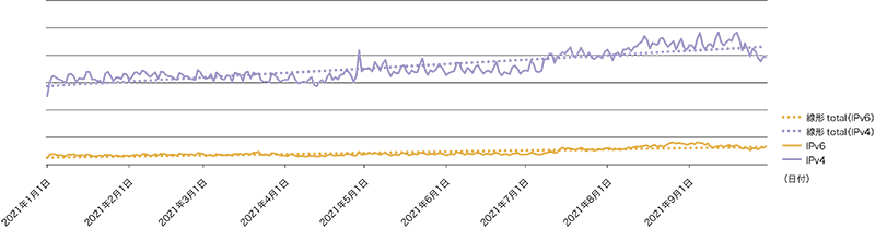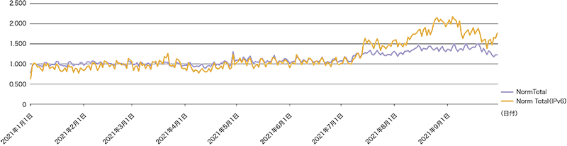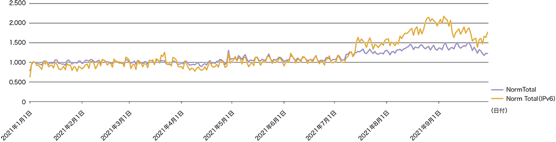 2021年のトラフィック量は、昨年あまり増加しなかった反動からか、IPv6もIPv4も右肩上がりで伸び、特に後半に大きく増加しています。図-4の正規化グラフ(仕事始めの1月4日を1として正規化)を見ると分かるとおり、IPv6が年初比で1.7倍以上、IPv4で1.2倍以上となりました。また8月中旬から9月上旬にかけて山があり、IPv6が一時的ではありますが年初比で2.2倍近く、IPv4でも1.5倍のトラフィックが計測された時期もありました。