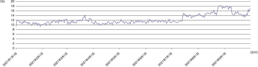 図-11 IIJmio インターネット向けトラフィック量の推移(2021年1月~ 10月)