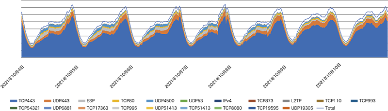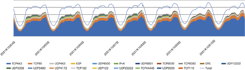 IPv6トラフィックのProtocol番号(Next-Header)と送信元ポート番号で解析したグラフを図-8に、IPv4トラフィックのProtocol番号と送信元ポート番号のグラフを図-9に示します。期間は2021年10月4日(月)から10月10日(日)までの1週間です。