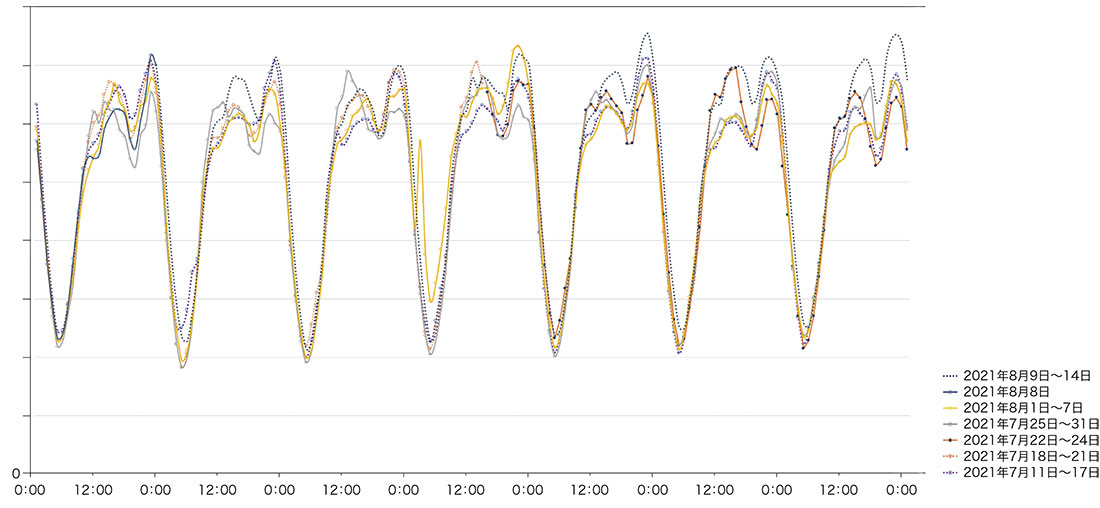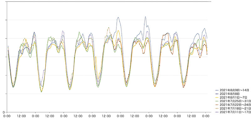 今回は7月11日から8月14日までの5週間の東阪のトラフィック及びIIJにおける国内の対外接続とのトラフィックデータを元に各週のトラフィックグラフを重ねて載せてみました(図-12、図-13)。オリンピック期間中の7月21日から8月8日までは実線、それ以外の期間は点線で示してあります。