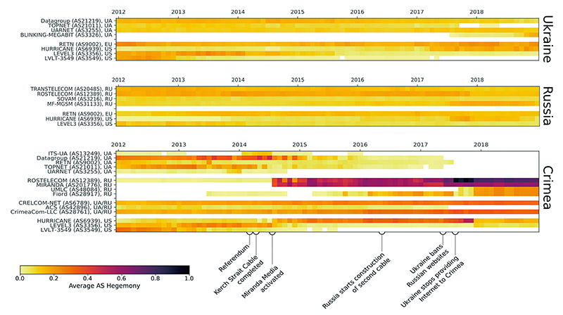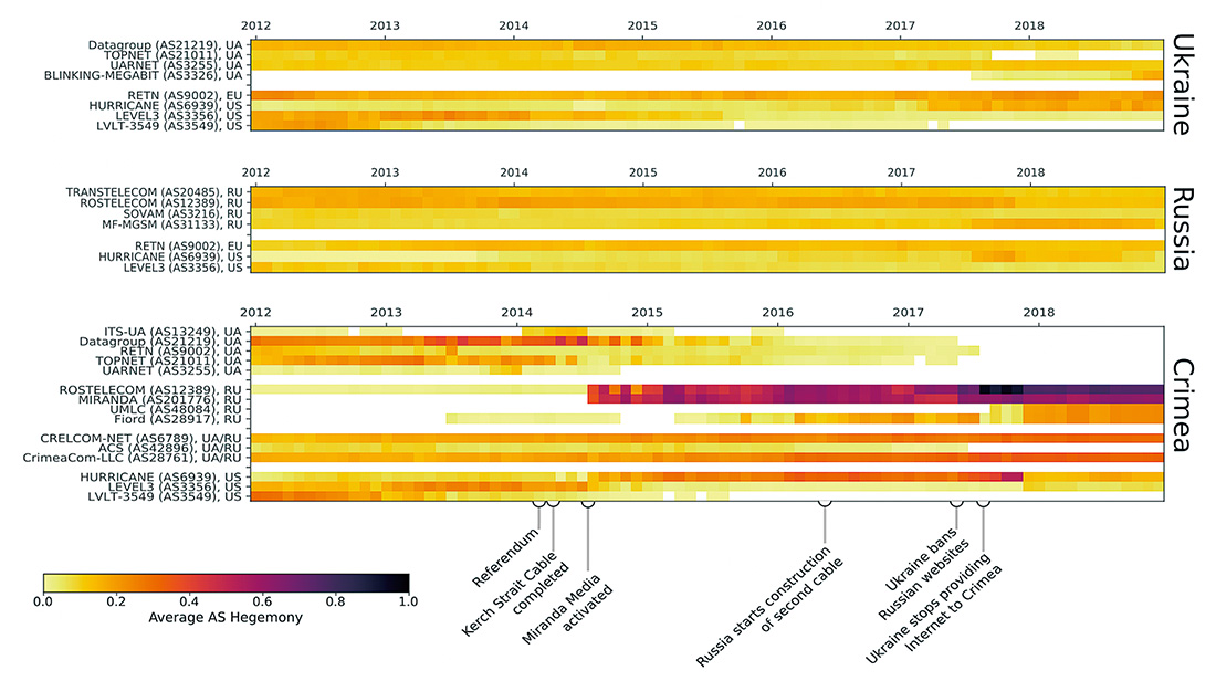 図-1 ウクライナ、ロシア、クリミアのネットワークのASヘゲモニー。スコアが高いほど依存性が高いことを示します。