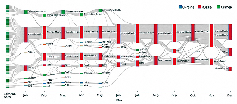 紛争地域としてのクリミアの地理的な状況と、米国及びEUからの制裁の結果、クリミア及びルハンスクとドネツクでは、インターネットサービスはグレーマーケットでした。ネットワークの経路が段階的に集約されインターネットサービス市場が独占されたことで、ネットワークが容易に支配できるようになりました。その結果、インターネット接続の品質と速度が低下し、エンドユーザのインターネットサービスの価格は上昇しました。