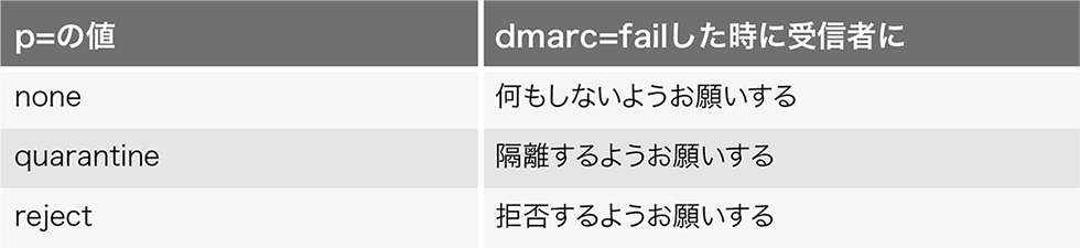 DMARCポリシーには、表-3の3つが指定できます。DMARCポリシーで重要なのは、送信者から受信者に対して"こうしてください"とお願いするだけであって必ず宣言したとおりに受信者側システムで取り扱われる訳ではない点です。受信側のメール解析システムにDMARCを評価するような機能、フィルタが実装されていなければ何の影響もありませんが、企業としてDMARCポリシーを外部に対して宣言することで自社ドメインの正当性を表明することができます。