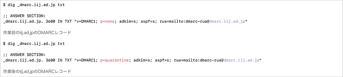 図-3 作業前と作業後のiij.ad.jpのDMARCレコード
