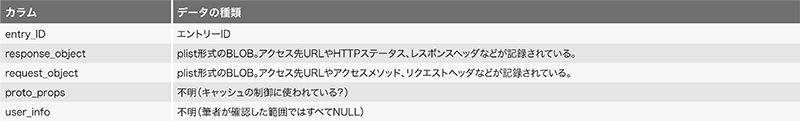 表-1~表-3を見ると、通信を行ったタイムスタンプ、アクセス先のURL、クライアントからのリクエストメソッド及びヘッダ、サーバのHTTPステータス及びレスポンスヘッダ、サーバからのレスポンスボディを取得することができます。これらのテーブルはentry_IDをキーにして各データを紐づけることができます。更に、Cache.dbが保存されているファイルパスの中にある「<Application Bundle ID>」部分は通信を行ったプログラムを指しています。プラグインとしては、これらの情報を取りまとめて解析結果として保存すれば良いでしょう。