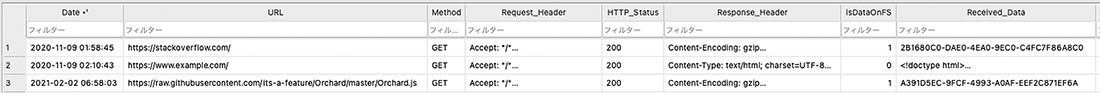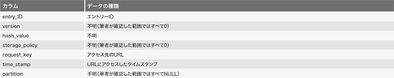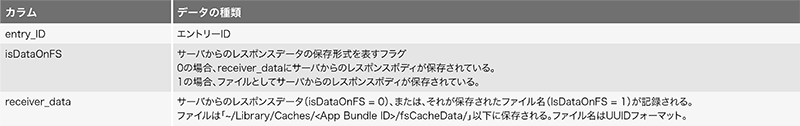 cfurl_cache_receiver_dataテーブル(表-2)のreceiver_ dataにはサーバからのレスポンスボディが保存されています。この情報もフォレンジック解析に有用であるため、解析結果に保存します。ただし、fsCacheDataディレクトリ以下にファイルとして保存されているデータは解析結果に含めるのではなく、ファイルのエクスポートをするのが良いでしょう。これにより、必要以上に解析結果のファイルサイズを大きくさせずに済みます。