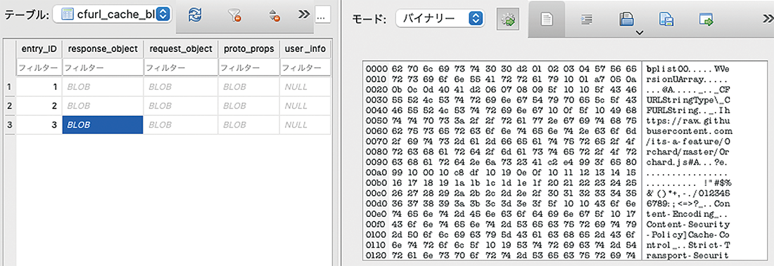 ところで、cfurl_cache_blob_dataテーブル(表-1)のresponse_ objectとrequest_objectはplist形式のBLOB(図-2)が保存されています(注2)。このデータはplist形式のまま解析結果として保存するのでなく、解析者が内容を把握しやすいようにパースした結果を保存すべきです。