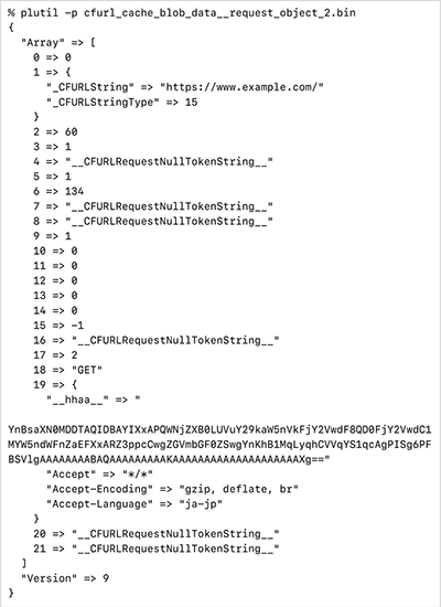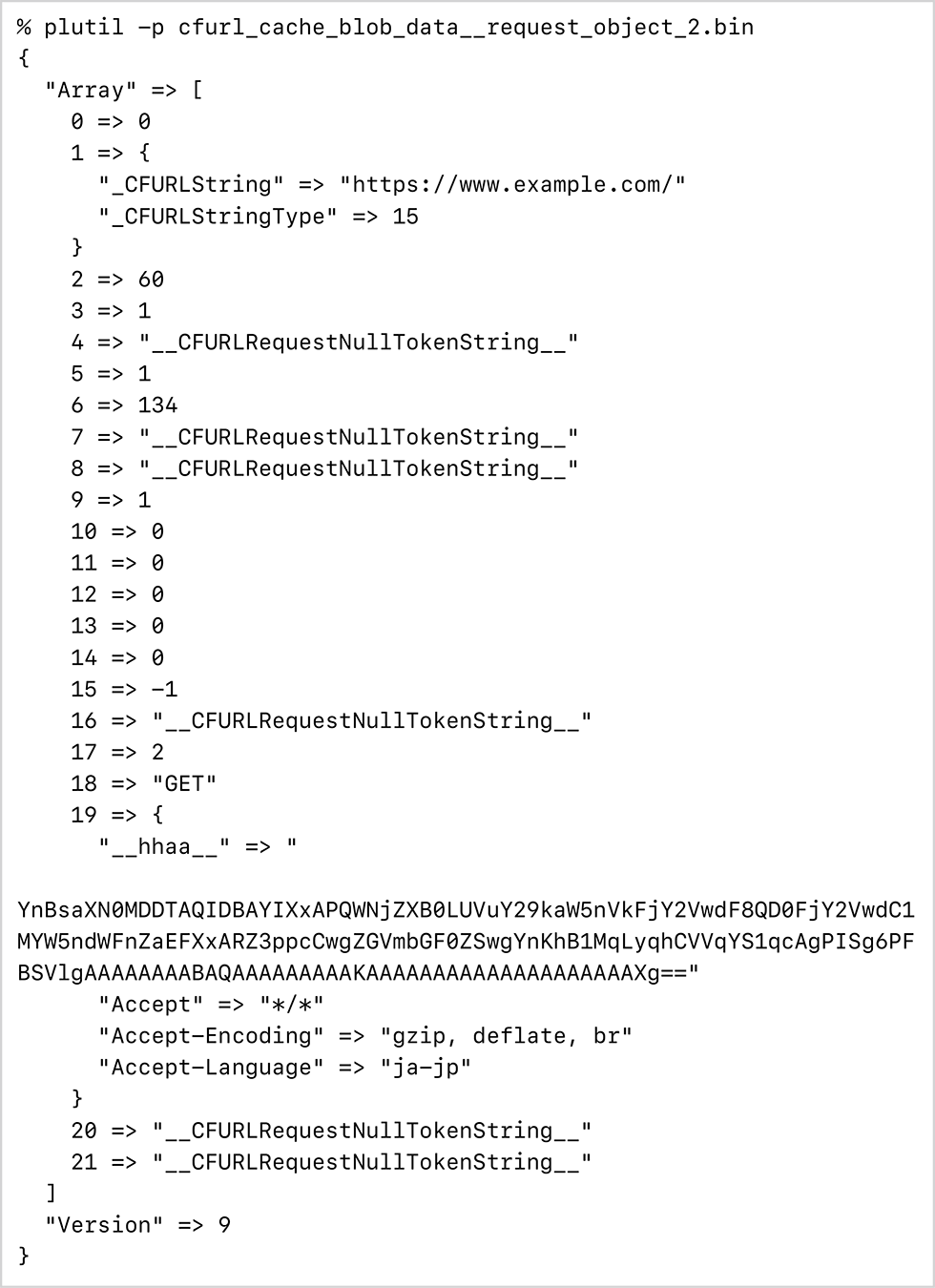 DB Browser for SQLite(注3)などでrequest_objectのデータをエクスポートして、macOS標準コマンドのplutilで確認すると図-3のようになります。この中でフォレンジック解析に必要そうなデータは、「Array」の18番目と19番目のデータです。18番目はHTTPリクエストメソッドで、19番目はHTTPリクエストヘッダです。