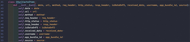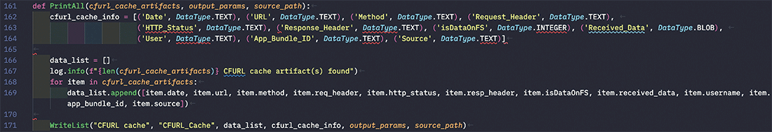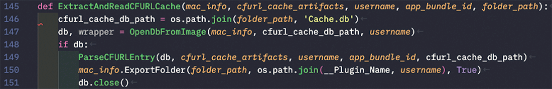 その後、IsValidFilePath()メソッドで各ディレクトリ以下のCache.dbファイルの存在を確認します(191行目)。存在する場合、ExtractAndReadCFURLCache()関数を呼び出し、Cache.dbの解析結果の取得及びアーティファクトファイルのエクスポートを行います(192行目)。解析結果はcfurl_ cache_artifactsにlistオブジェクトとして保存されます。