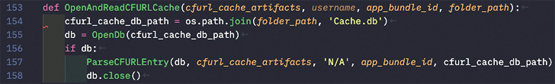 Cache.dbはOpenDb()関数内でオープンします。この関数では、mac_aptのCommonFunctionsクラスのopen_ sqlite_db_readonly()メソッドでコネクションを取得します。データ解析は上述したようにParseCFURLEntry()関数で行います。