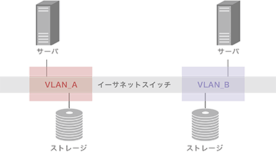 1つのネットワークに複数のシステムを収容する場合、IP-SANで各システム間のセキュリティを担保する方法として、イーサネットのVLANを利用しネットワークを論理的に分断することが一般的かと思います。図-1のように1つのシステムにそれ専用のストレージを接続する場合は特に難しい構成ではありません。しかし、図-2のように複数のシステムに単一のストレージを接続する場合、ストレージ側のインタフェースで複数のVLAN(VLAN Tagging、IEEE 802.1Q)をサポートする必要が出てきます。
