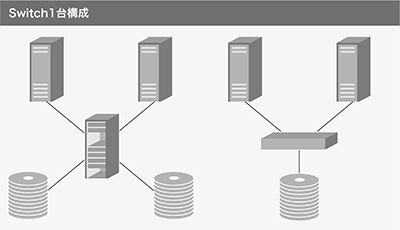 また、この例ではFC-SAN、IP-SANとも、スイッチの台数は1台ですが、ストレージとサーバの間に複数台のスイッチがある場合、IP-SANはすべてのスイッチに対してVLANの設定が必要になるのに対し、FC-SANはゾーニング情報が接続されるスイッチすべてで共有される仕組みがあるため、どれか1台だけ設定をすれば良く、作業量を比較するとFC-SANの方が少なくなります。