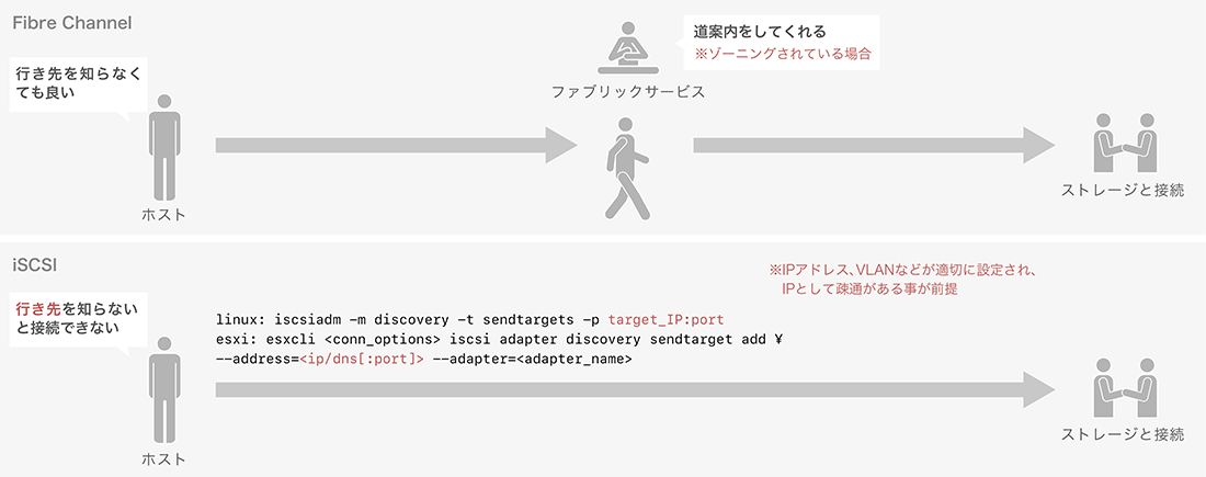 FCスイッチではファブリックサービスがあり、これはFC-SANに接続されているすべてのデバイスや、サーバとストレージを接続するために必要な情報を管理します。ファブリックサービスのほんの1例を挙げると、ストレージとサーバを繋ぐゾーニングを適切に設定していれば、サーバに特別な設定をせずともストレージと自動的に接続する仕組みです。IP-SANに同様の機能はInternet Storage Name Service(iSNS)として存在はしていますが実装は限定的で利用されている環境はほぼありません。そのため、IP-SANではサーバに接続対象のストレージを記憶させて接続させる方法を取ります。違いをまとめたのが図-7です。