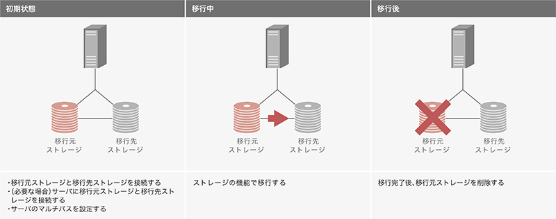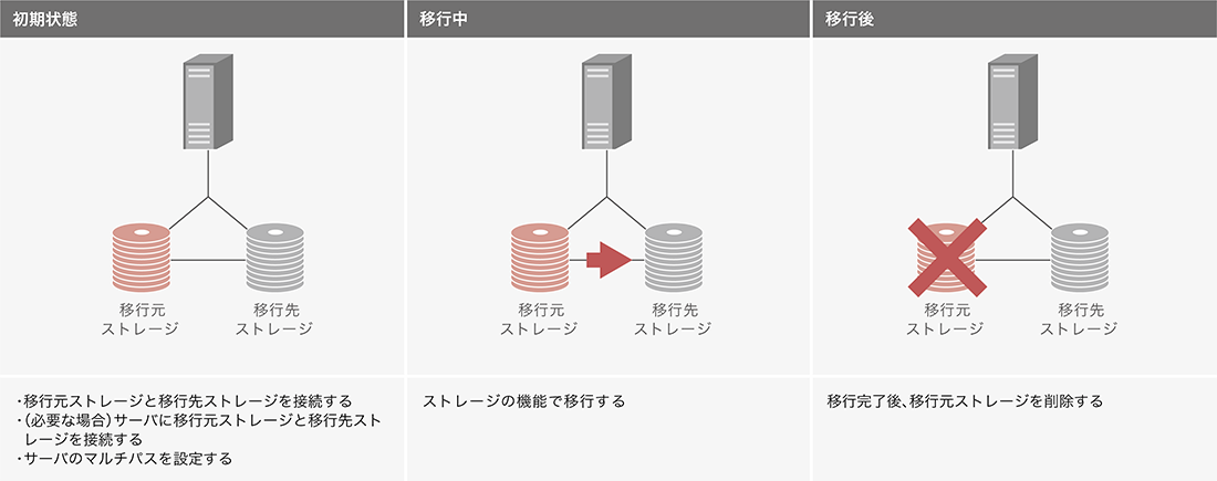 ただし、もともと論理ボリュームマネージャを使用していない環境では、この方法を用いることはできないため、そのような環境では前述のファイル単位の移行を行うほかに、後述するストレージの移行機能を用いるしかありません。
